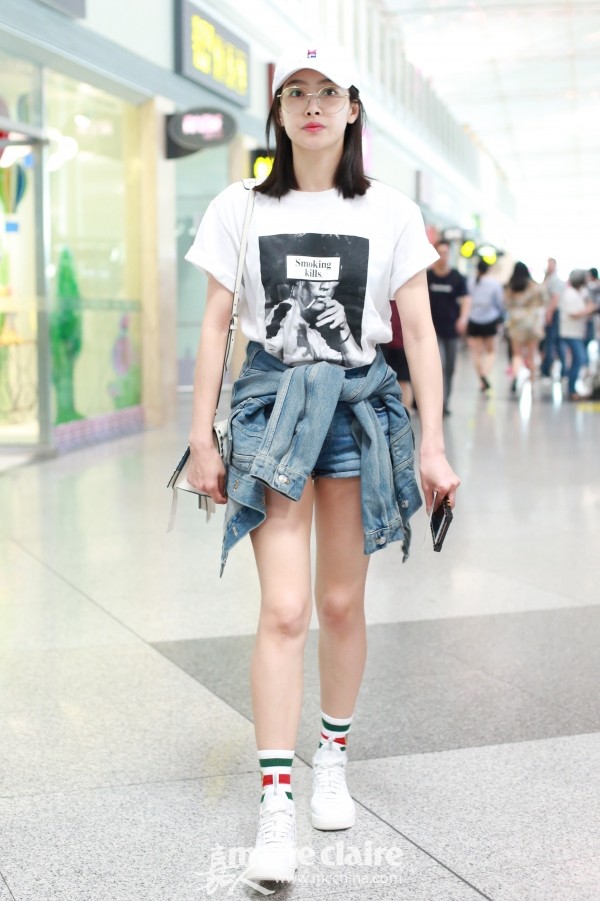 宋茜头戴白色印花鸭舌帽,戴金丝边圆框眼镜,身穿白色印花T恤,肩背Prada白色圆钉镶嵌手袋,下穿蓝色牛仔短裤,系蓝色牛仔夹克,脚踩Nike白色网面拼接球鞋,内搭Gucci拼色条纹虎头刺绣短袜。